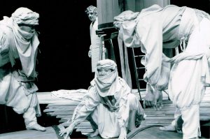Comme les personnages de Shakespeare, nous nous retrouvions sur la « plage blanche » de notre grand livre. Il fallait à notre écriture un sens dans lequel aller mais aussi le temps de s’y rendre. C’est donc un travail conjoint qui s’est entamé, entre jeu théâtral et écriture. La rédaction du texte a commencé à partir d’improvisations sur un synopsis et s’est poursuivie au long des répétitions jusqu’à ce que se réalise une osmose entre le texte et le travail de plateau.