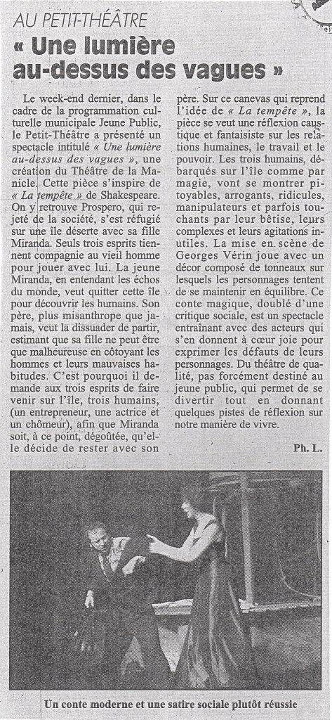 Le Théâtre de La Manicle était en cours de recherche et d’expérimentation sur le thème du « travail » . Les idées et les pratiques se confrontaient, s’épaulaient. Dans cette démarche, nous avons relu le texte de « La Tempête » ; mais, loin de vouloir l’adapter, nous avons seulement repris le canevas : un homme, rejeté de la société, a vécu vingt ans avec sa fille dans un endroit à l’écart du monde. Cet homme va faire venir dans son monde d’autres hommes pour les affronter.